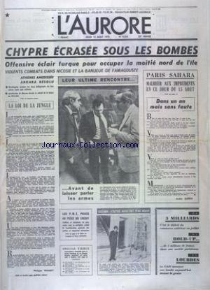 AURORE (L') [No 9316] du 15/08/1974 - CHYPRE ECRASE SOUS LES BOMBES - PARIS SAHARA PAR GUERIN - LES PME PRISES AU PIEGE DU CREDIT - GISCARD - L'ELYSEE AUSSI FAIT PEAU NEUVE - LOURDES - LE GARI ANNONCE UNE BOMBE DEVANT LA GROTTE Description