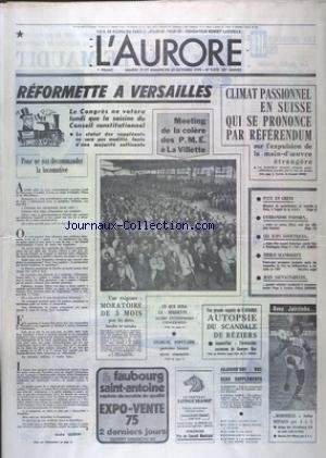 AURORE (L') [No 9372] du 19/10/1974 - REFORMETTE A VERSAILLES - MEETING DE LA COLERE DES PME A LA VILLETTE - CLIMAT PASSIONNEL EN SUISSE QUI SE PRONONCE PAR REFERENDUM - LES SPORTS - FOOT - LES JUIFS SOVIETIQUES - ENJEU D'UN ACCORD HISTORIQUE Info