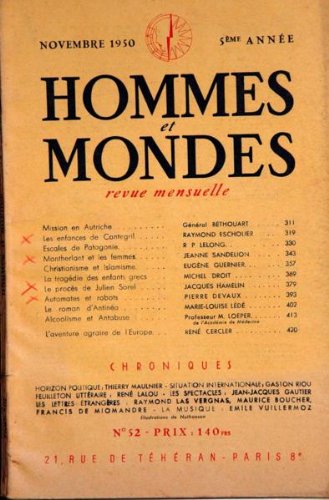 HOMMES ET MONDES [No 52] du 01/11/1950 - MISSION EN AUTRICHE PAR BETHOUART - CANTEGRIL PAR ESCHOLIER - PATAGONIE PAR LE R.P.LELONG - MNTHERLANT ET LES FEMMES PAR SANDELION - E. GUERNIER - M. DROIT - PROCES DE J. SOREL PAR HAMELIN - P. DEVAUX - M.L. LEDE - PR LEOPER - RENE CERCLER. Description