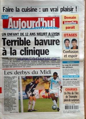 AUJOURD'HUI [No 1038] du 02/10/2004 - faire la cuisine , un vrai plaisir un enfant de 12 ans, malo, meurt a lyon - terrible bavure a la clinique les derbys du midi, foot ligue 1 otages, confusion et espoir petrole , le coup de semonce des pecheurs salon top resa , ou partir cet hiver Description